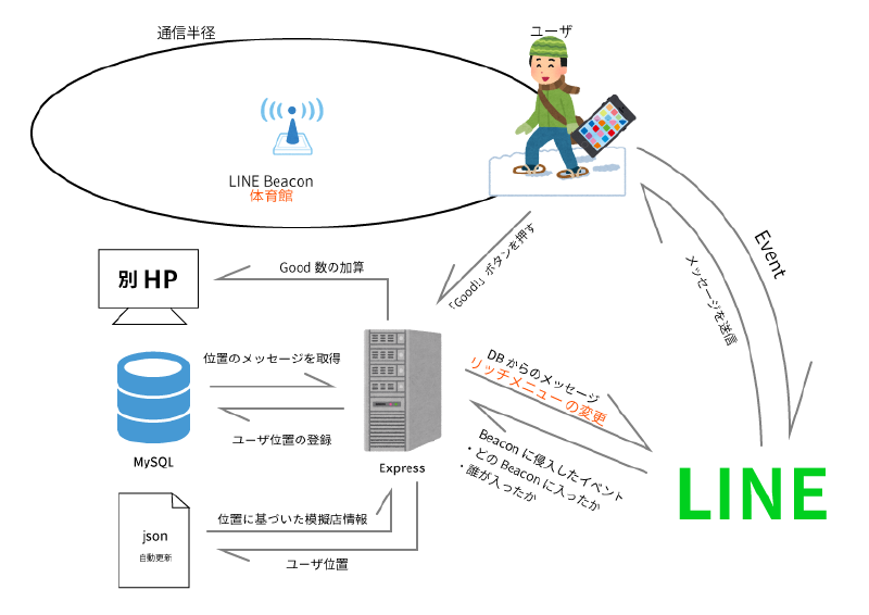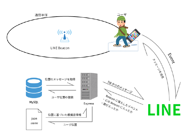 LINEのサーバから Beaconイベントが届くので Enter ならユーザのデータベースに位置情報を保存しておく。